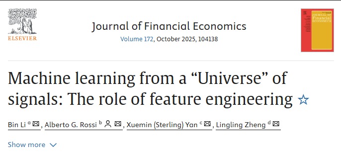 研究成果: Machine learning from a “Universe” of signals: The role of feature engineering(从“信号宇宙”中进行机器学习:特征工程的作用)作者:李斌, A. Rossi, S. Yan, 郑凌凌发表期刊:Journal of Financial Economics, 2025, 172, 104138我们基于一组基本面信号构建了实时的机器学习投资策略。尽管这些策略能够获得经济显著且统计显著的样本外收益,但其表现明显弱于现有文献中使用人工筛选的信号所得到的结果。相较之下,...